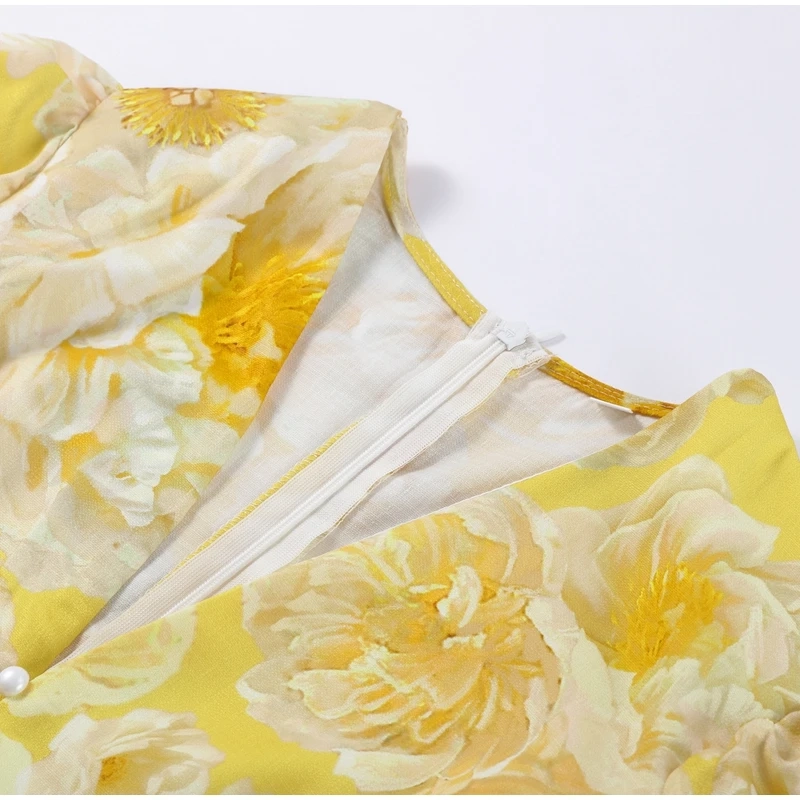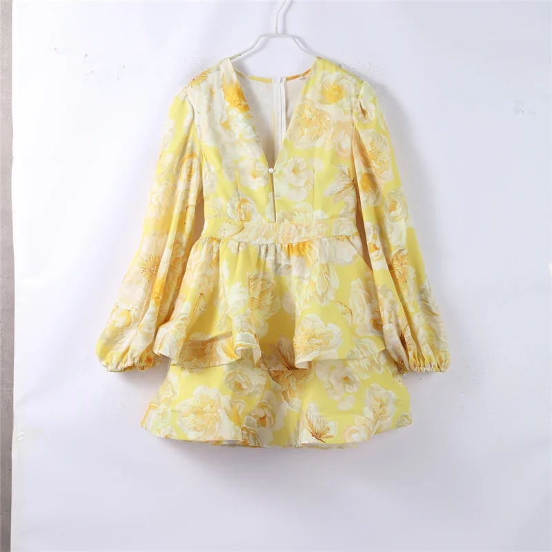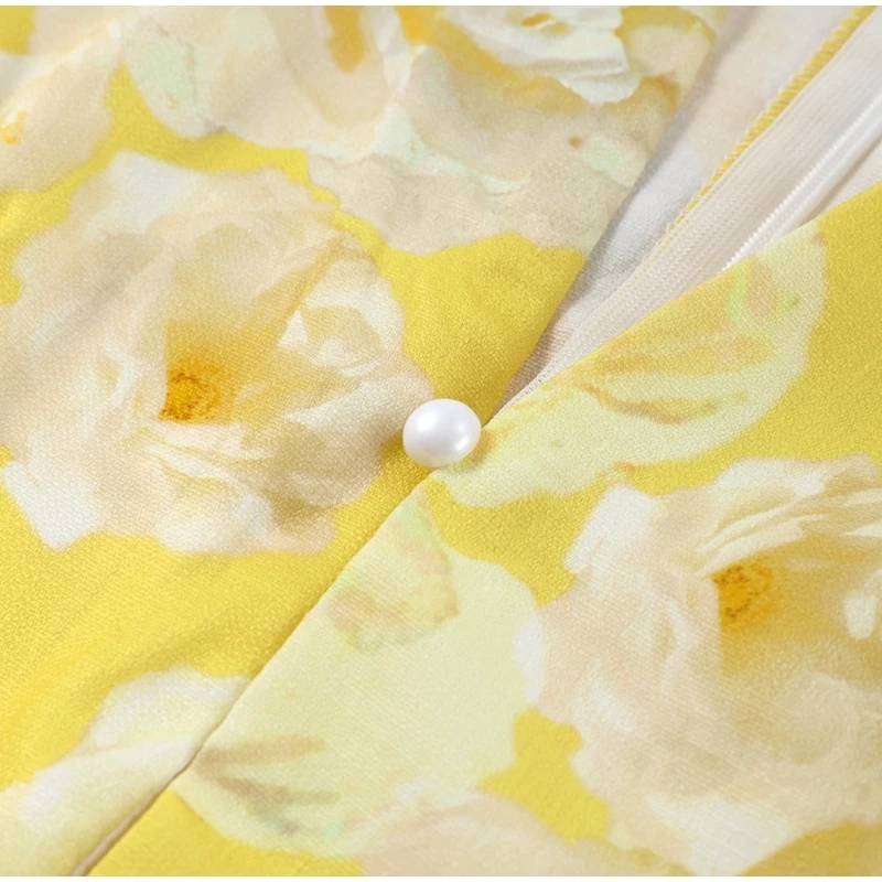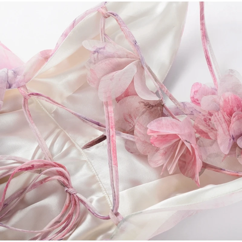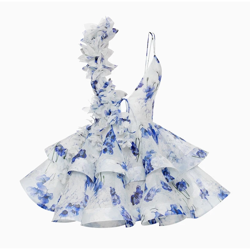 Women Elegant 3D Flower Print Sling Lace Up Ruffle A-line Mini Evening Dresses
