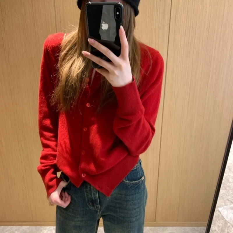 Elegant round-neck 100 pure cashmere knitted cardigan