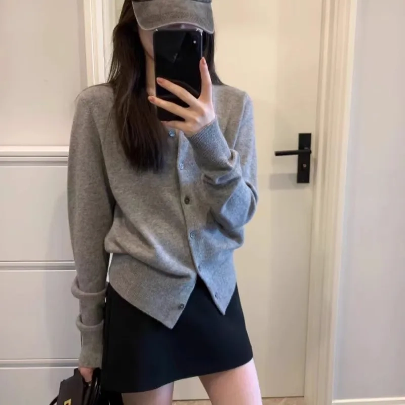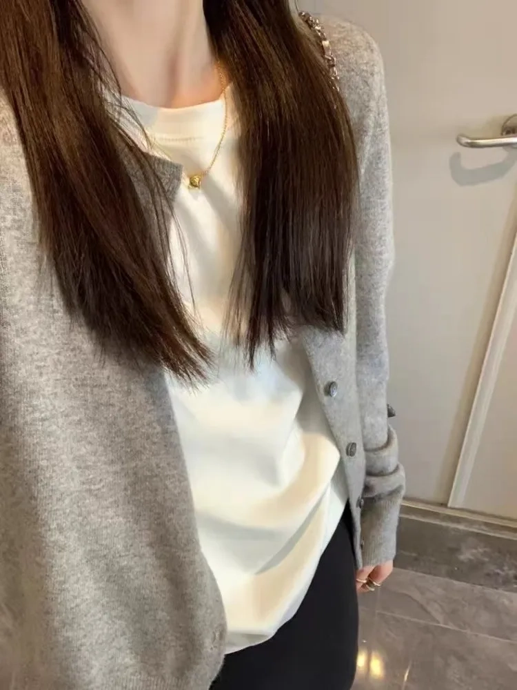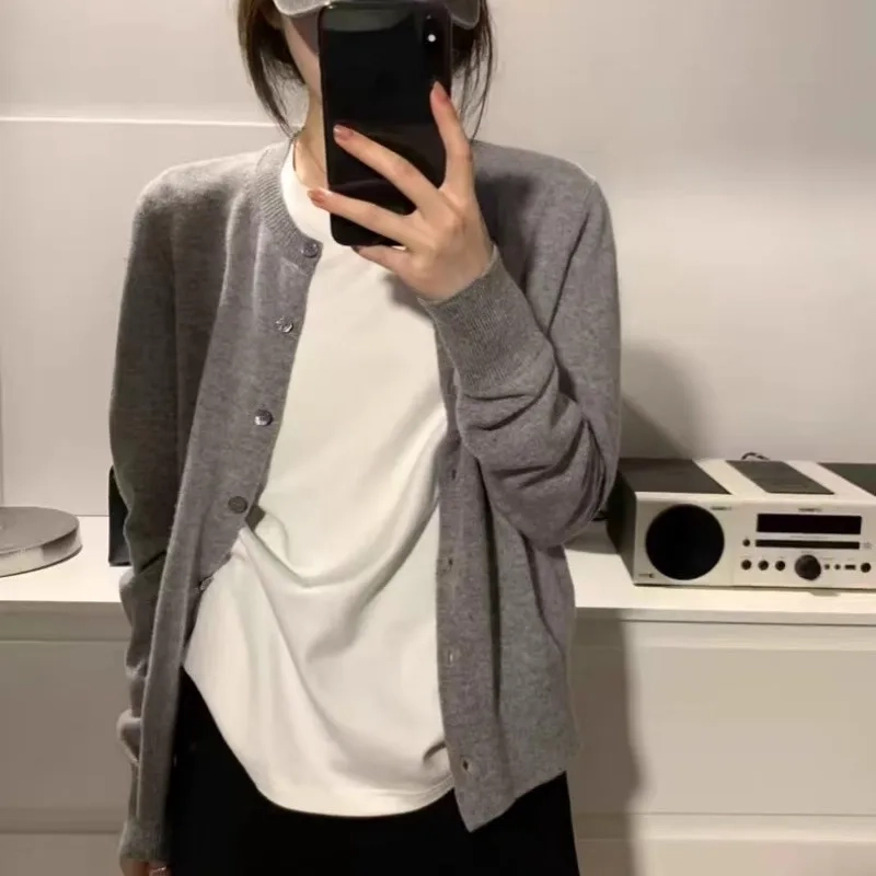 Elegant round-neck loose 100 pure cashmere knitted cardigan