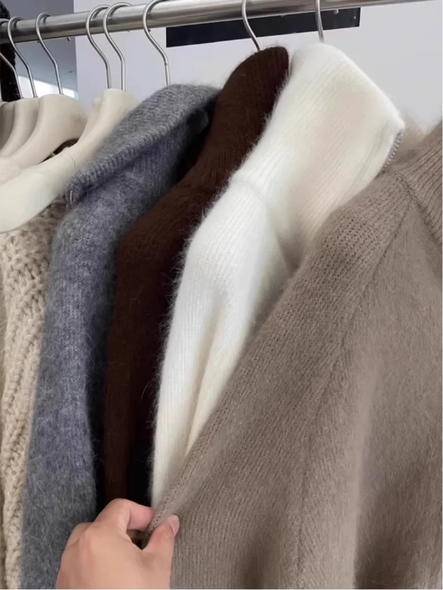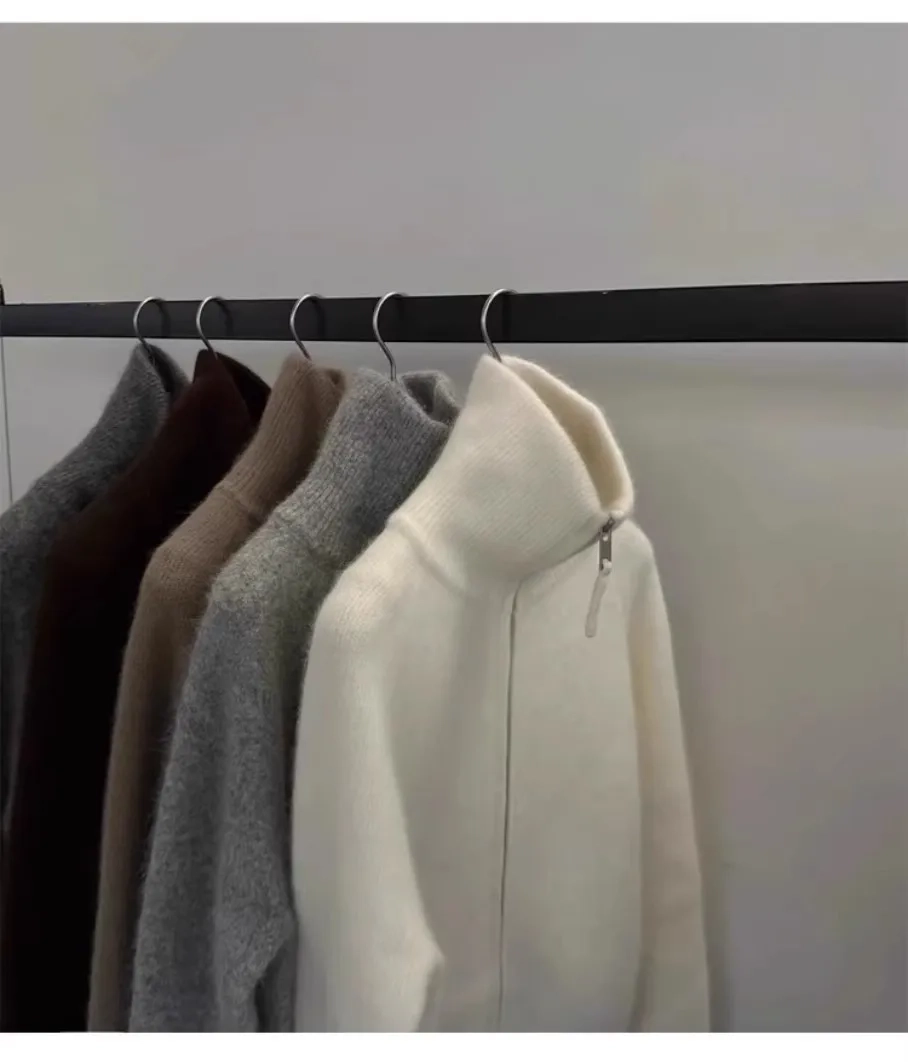 double zipper 100%wool cardigan women high neck loose cashmere sweater thickened coat