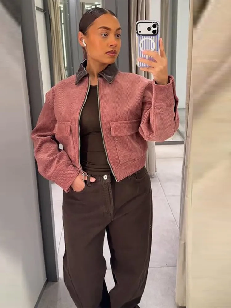 Fashion Pink Corduroy Cropped Jacket