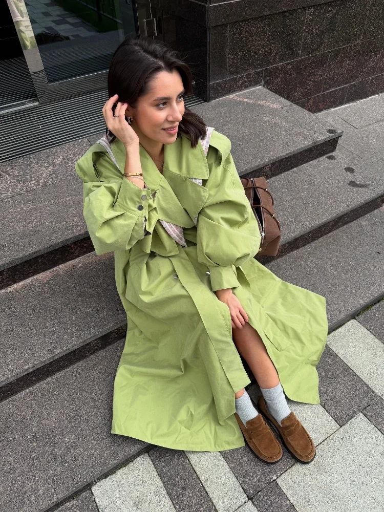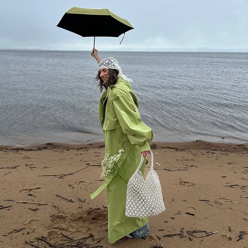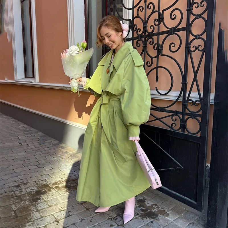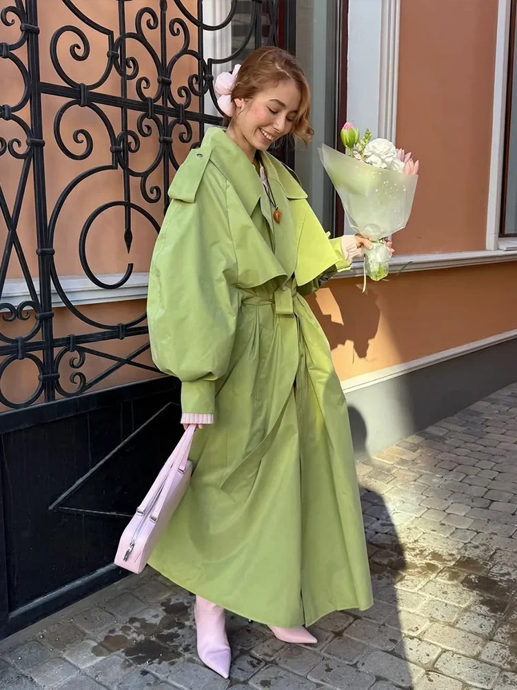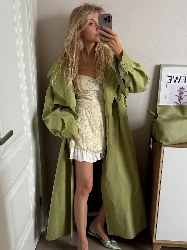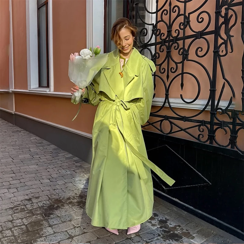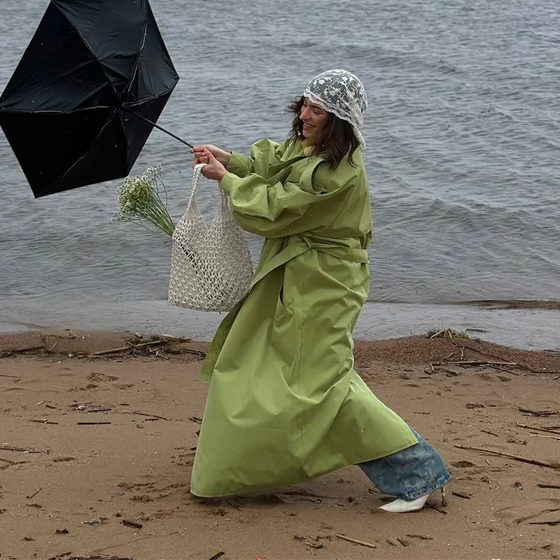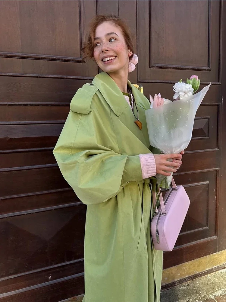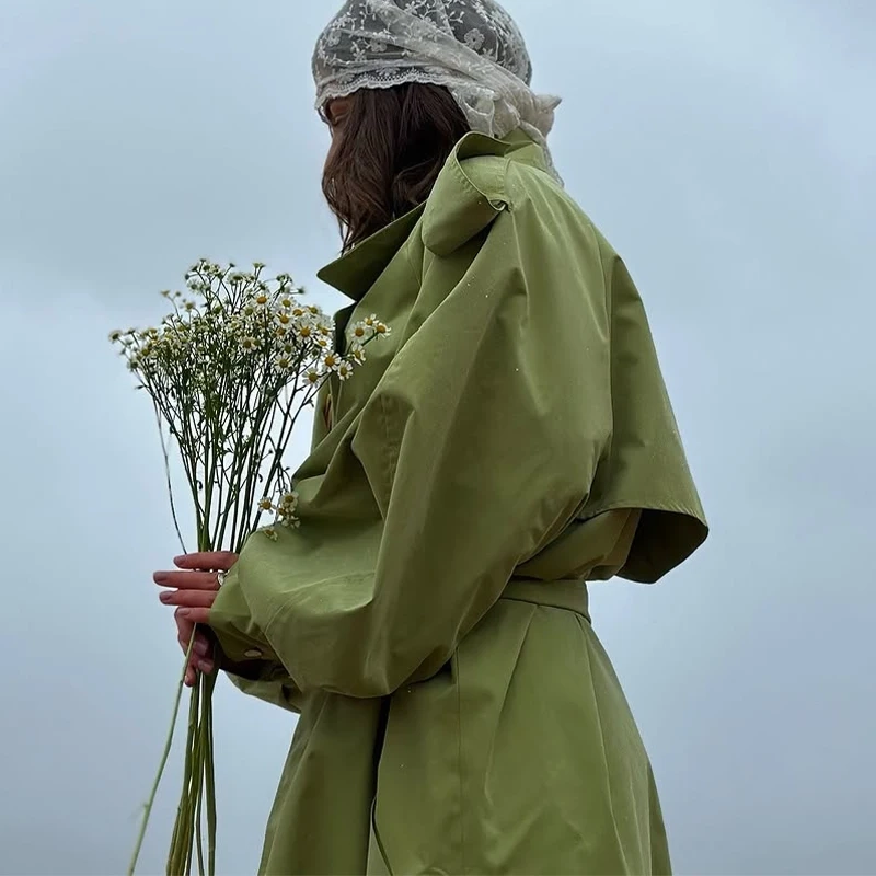 Women Green Lace-up Trench Coat